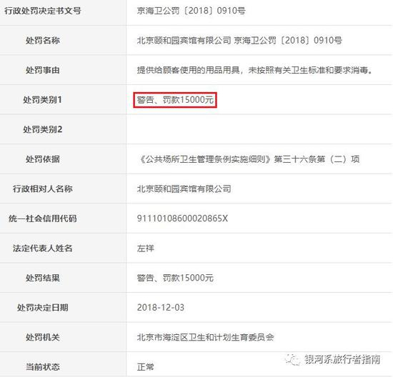 最值得一说的是海淀区卫计委对北京颐和安缦的调查和处罚,同样是依据《公共场所卫生管理条例实施细则》第三十六条第二项,罚款的金额却是15000元。