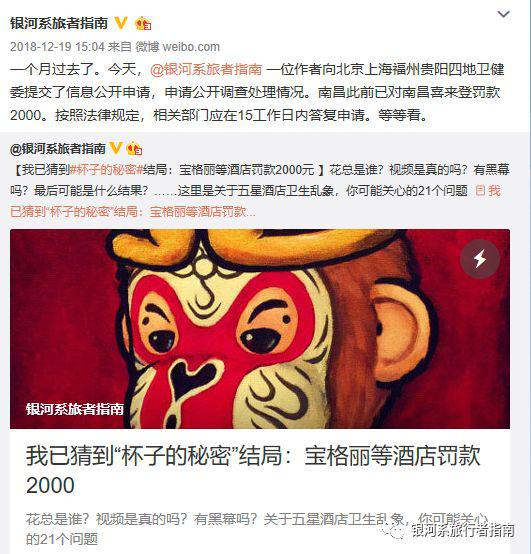 11月17日,@银河系旅行者指南 推送了我已猜到“杯子的秘密“的结局:宝格丽等酒店罚款两千 。当时,事件刚发生两天,银河悲观的猜测事情可能不会有什么大的改变,涉事的酒店们可能会被罚款2000。