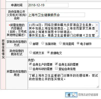 依申请公开的页面里,有上海市政府的各个委办局,也有各区政府。具体到这次申请,我们有两个路径可选,一个是向酒店所在的黄埔、静安、浦东区政府申请,一个是向市政府主管部门申请。为了和其他城市横向对比方便,我们对几个城市都是直接向市卫健委申请