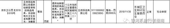 11月30日,东城区卫健委对北京王府半岛酒店处以警告、罚款2000元。