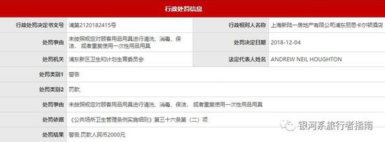 上海丽思卡尔顿酒店 警告,罚款2000元