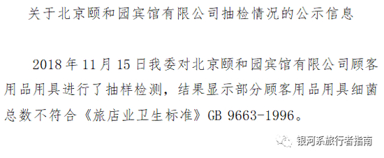 海淀区卫计委还同时公布了花总《杯子的秘密》播出第二天,对颐和安缦的检查结果,“结果显示部分顾客用品用具细菌总数不符合《旅店业卫生标准》GB 9663-1996”