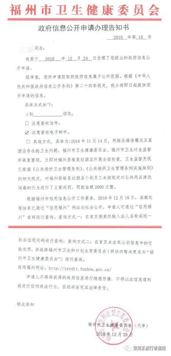 12月19日,@银河系旅行者指南 做了一个实验。旅行者公会的一位作者以个人身份向上海、北京、贵阳、福州等地的卫健委提交了信息公开申请,申请公开《杯子的秘密》里被曝光的酒店们后来的调查处理情况。
