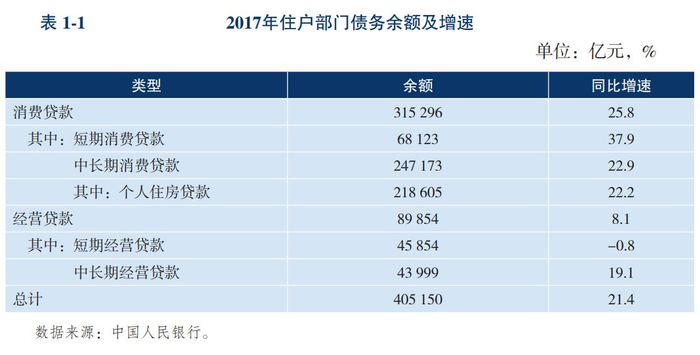 而根据央行《中国金融稳定报告2018》,截至2017年末,全国住户部门债务余额40.5万亿元,其中,个人住房贷款余额21.9万亿元。