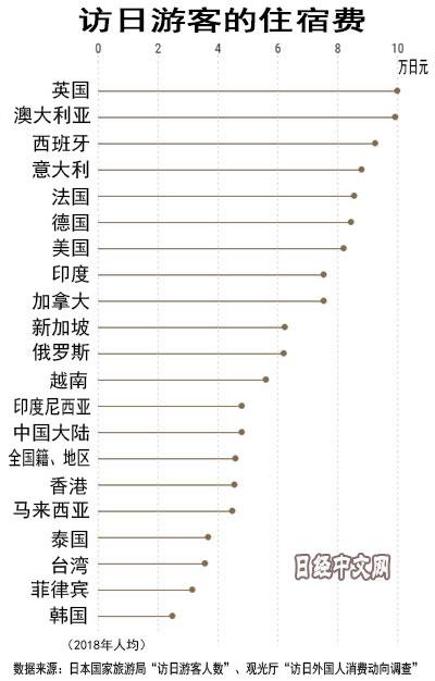 2018年的访日游客的人均住宿费,英国游客消费最高,其次是澳大利亚和西班牙。欧洲游客的住宿费相对较高,亚洲国家偏低。