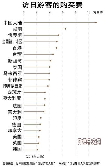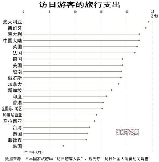 2018年访日游客人均旅行支出减少0.9%,为15.2594万日元。其中,2017年位居首位的中国大陆减少2.9%,下滑至第4位。澳大利亚上升至首位,西班牙和意大利紧随其后。