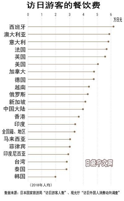 2018年访日游客的人均餐饮费,西班牙游客位居首位。在西班牙,日料越来越受到关注,日本的吸引力增强。餐饮费排行榜的前几位被欧洲国家占据。