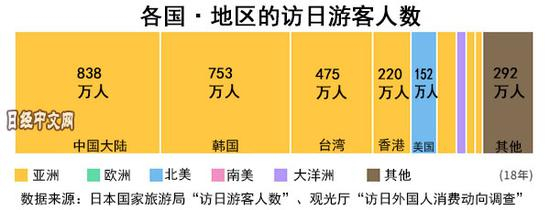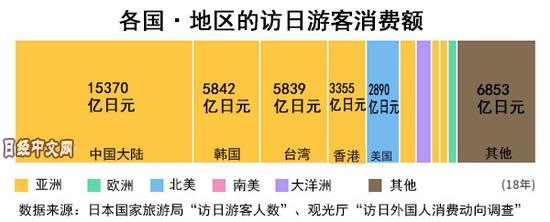 在2018年访日外国游客的消费额方面,中国大陆游客占34.1%,位居首位;和韩国(13%)加起来占总消费的近一半。再加上台湾地区、香港地区和美国,排名前五位的占访日游客总消费额的7成以上。