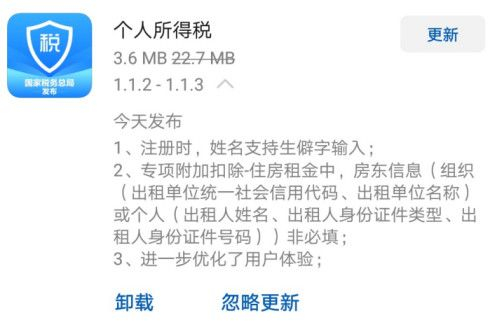 今天(20日)“个人所得税”APP安卓版更新到1.1.3版本,最新版本显示,在住房租金信息的填写上,不在强制用户填写房东的信息,其中房东的姓名、身份证全部改为“选填”。