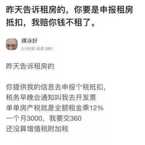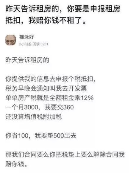前阵子一篇题为《房东跟租客说,你要是申报租房抵扣个税,房子就不租给你了!》的文章在网上流传。文章以租房者的口吻称,房东告诉他,“如果你去申报住房租金抵扣个税,房子就不租给你了,我宁愿退房租!”房东还算了一笔账,如果租客拿他的信息去申报个税抵扣,税务部门就会通知房东去交税。最终,租客省了100元,房东却要多纳税500元。