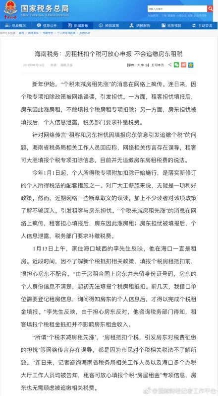 前几天,国家税务总局转载海南日报文章:海南税务称房租抵扣个税可放心申报,不会追缴房东租税。