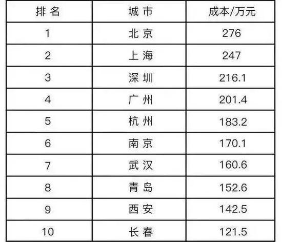 2018年有媒体晒出过《中国十大城市生养成本排行榜》,里面算的是从出生到大学毕业。北京和上海排在第1名和第2名,分别是276万和247万,三四名深圳和广州的也超过了200万,杭州、南京、武汉分列5、6、7名,在160万至180万之间,第10名的长春,也超过了120万。