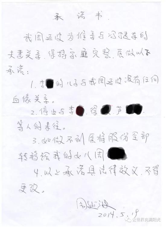 周延波也曾向我承诺:“我周延波为维系与冯捷东的夫妻关系,保持家庭完整,愿做以下承诺:1,LI某的儿子与我周延波没有任何血缘关系;2,停止与LI某、XU某、LU某某等人的来往;3,如做不到愿将股份全部转移给我的女儿;4,以上承诺具法律效义,不得更改。”
