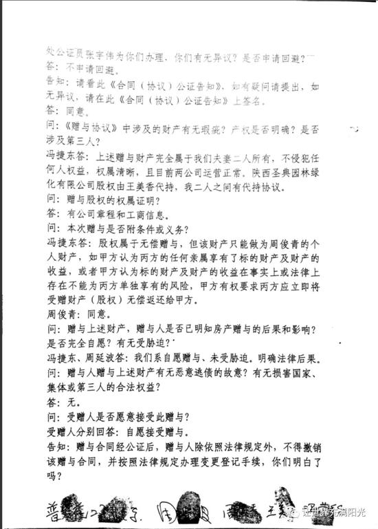 公证赠与女儿的财产,连我们家庭总资产的十分之一都不到!然而,周延波对我提起离婚后,对女儿的这点儿财产也不放过。他先是让曾经办理公证赠与的薛劲松律师代表自己到公证处复议,要求撤销赠予公证。公证处经过严格的程序审查后答复:公证过程合法,手续完备,驳回请求。周延波一不作、二不休,竟向西安市中院起诉,要求撤销2014年5月5日签订的《赠与协议》,要夺回女儿的财产。而公证赠与女儿的股权,已经合法转让给由周延波介绍的北京一家公司,并且转让所得在依法纳税后也已按公证赠与协议的约定转给了女儿。但是周延波为了混淆视听,达到事后反悔的目的,不惜跟法院撒谎说他不知道此事。