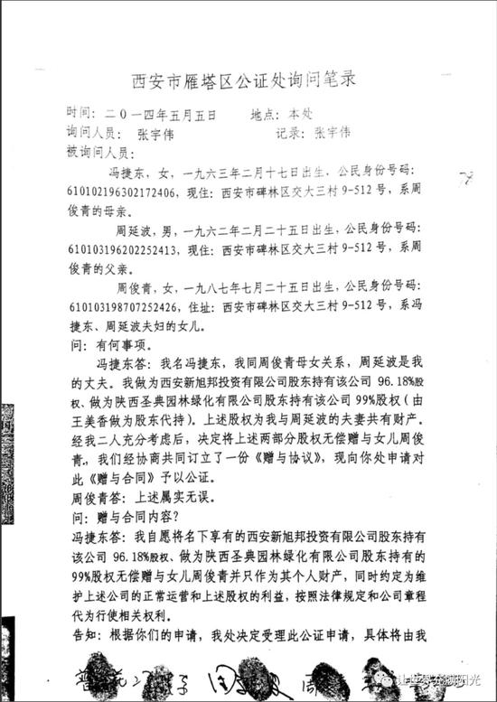 2014年年初,我们的独生女儿计划结婚,需要签署婚前财产协议。5月5日,我们一家三口在周延波的律师薛劲松的安排下,到西安市雁塔区公证处签署了财产赠与协议并办理了公证,将我名下持有的两家公司股权赠与了女儿。5月6日,薛劲松又安排我们一家三口在周延波办公室签订了经律师见证的赠与协议,将周延波名下持有的两家公司股权也赠与女儿。