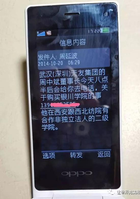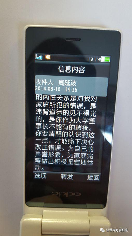 我本来对周延波很放心,不信携手相伴几十年的丈夫会出轨,毕竟他是做教育的,为人师表,不会做出违反道德的事。但为保护家庭,我回西安后还是开始关注周延波,并查看了他的手机。手机中的内容,告诉我一个残酷现实:自己的“中国民办教育家”、陕西省人大代表(时任)丈夫,实际上早就婚内多次出轨。
