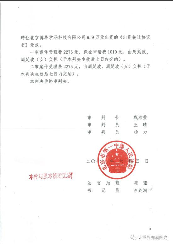 后来我才发现,周延波在起诉离婚后的一个月内,已悄悄把名下30多亿元的夫妻共同财产,全部转移给了他的司机奚忠华、秘书谢承炎、北京公司情人LI某的妹妹兼他的女秘书。最离奇的是,周延波瞒天过海,竟把资产最大的北京博华百校集团和北京博华学涵两家公司的股权,转移到了同名同姓不同性别的另一位女性周延波名下,而这位女周延波只是西安思源学院的一名普通代课教师,周延波时任秘书谢承炎的妻子。