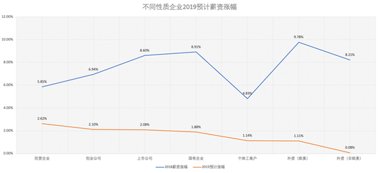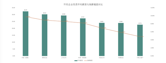 虽未出意外,但依然值得指出的是,“薪资水平”和“薪资涨幅”各性质企业排序一致,即薪资高,涨幅也大。