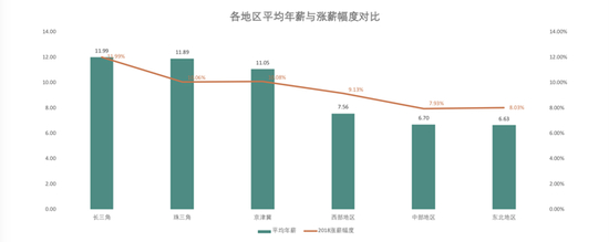 从各大地区的对比来看,长三角、珠三角、京津冀地区分别以11.99万元、11.89万元、11.05万元的平均年薪包揽前三,而东北地区以6.63万元位列最后一名。随着天津“海河英才”人才引进计划等政策的发布,京津冀地区的薪资涨幅达到10.08%,超过了珠三角地区。