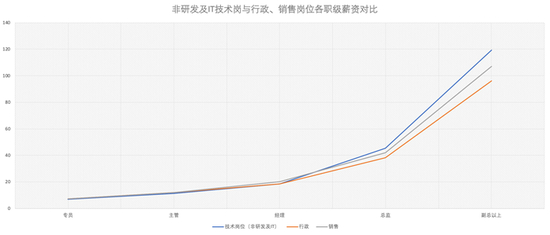 本次调研中我们惊讶地发现,对于一些非研发和IT的技术岗位,其职业成长变化十分迷人:刚入职的基层专员平均年薪仅为6.75万元,到了经理级别也只有18.33万元,然而到了总监级别却达到惊人的45.52万元。