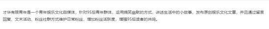 据该公司简介称,“才华有限青年”自媒体号的主要针对95后年轻群体,用搞笑幽默的方式讲述生活中的小故事,发布原创娱乐文化文章。