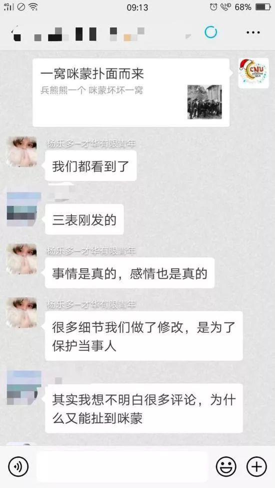 针对各界对《一个寒门状元之死》一文的质疑,一张疑似杨乐多回应此事的聊天截图显示,杨乐多称刷屏文中所描述“事情是真的,感情也是真的,很多细节我们做了修改,是为了保护当事人”。