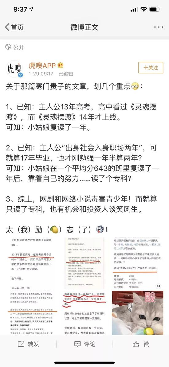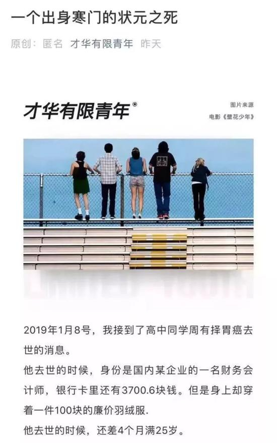 前天(1月29日),微信公众号“才华有限青年”发布了上述“状元之死”的文章,讲述了一个所谓出身寒门的理科状元历经奋斗仍然死去的故事,细节很多,看起来煞有其事,发布后迅速刷屏。