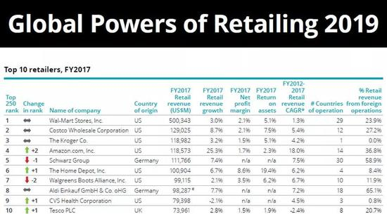 这份榜单上的全球前250大零售商(Global Powers of Retailing Top 250)在2017财年的总营收为4.53万亿美元,其中前十大零售商营收之和为1.43万亿美元,占总营收的31.6%。250大零售商2017财年的平均营收为181亿美元。