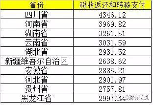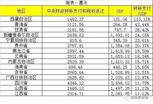 财税下沉的规模有多大,我们来看一组数字。下面是中央财政转移支付和税收返还相对GDP比重最大的15个省市区: