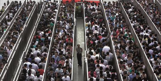 北京天通苑地铁站外排队进站的人群。图 / 视觉中国