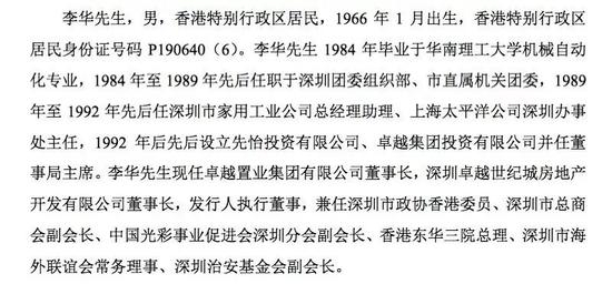 现年53岁的李华籍贯四川内江,原名李晓华,早年曾任职于深圳市团委,后下海经商。上世纪90年代获得香港居民身份,并创办卓越集团,从事住宅和商业地产开发,曾开发卓越蔚蓝海岸、卓越时代广场等标杆项目。目前,卓越集团旗下产业主要包括房地产开发、金融投资及资产管理等。