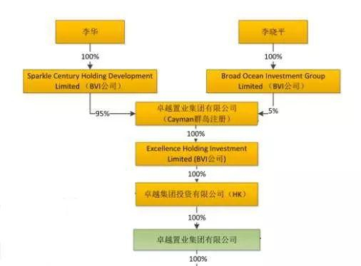 卓越集团全称卓越置业集团,母公司为卓越集团投资有限公司(香港企业)。层层穿透后,李华和哥哥李晓平通过BVI公司分别持有95%、5%的卓越集团股权。卓越集团目前没有上市。