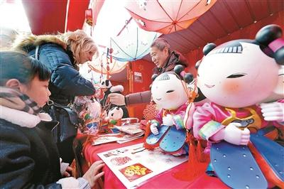 在一个主打春节“福娃”的文创摊位前,年味十足的“年娃”、“春妮”毛绒人偶玩具和红灯笼也让人爱不释手。第一次参加庙会的摊主嗓子已经喊哑了,她告诉北青报记者,这次准备了500对“年娃”和“春妮”,以及2000个红灯笼,没想到庙会刚开幕,红灯笼就卖出500多个,“年娃”和“春妮”卖出100多对,照这个速度,用不了两天就要脱销了。