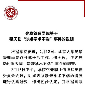 根据学校要求,2月12日,北京大学光华管理学院召开博士后工作小组会议,正式启动对翟天临“涉嫌学术不端”事件的调查。