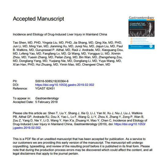 近日,上海交通大学医学院附属仁济医院消化内科主任医师茅益民和中国人民解放军第85医院陈成伟教授作为共同通讯作者,在消化疾病领域顶级期刊《胃肠病学》(Gastroenterology,影响因子20.773分)在线发表了题为《中国大陆药物性肝损伤发生率及病因学》的研究论文。据悉,该论文是中国学者首次在世界顶级医学期刊发表的反映中国大陆药物性肝损伤(简称DILI)流行病学、病因学、临床特征等整体现状的研究论文,引起国际同行高度重视。