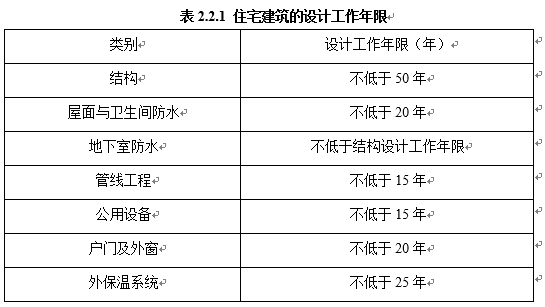 住宅建筑设计工作年限应符合以下规定:结构设计使用年限不低于50年,地下室防水不低于结构设计工作年限。(2.2.1)