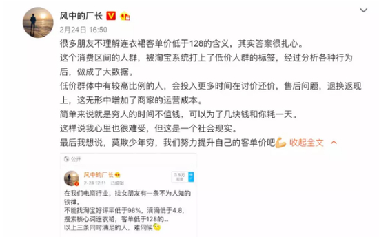 这种莫名其妙的行为艺术,源头是网友“风中的厂长”发的一条微博:淘宝连衣裙客单价低于128,会被淘宝方面标注为“低价人群”。