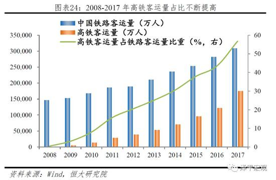 铁路基础设施建设高速发展,出行价格低,仍是中国人出行的首选交通方式。2008-2017年中国铁路基础设施建设尤其是高铁基础设施实现了高速发展,高铁客运量占比由不足1%大幅提高至56.8%,速度快、价格适中的高铁迅速成为中国人出行的重要选择;此外,2017年中国铁路客运量超过30.84亿次,按照每人年均4次乘坐铁路,则2017年超过7亿人选择铁路出行,可见,价格更优惠的铁路依然是中国人出行的首选交通方式。