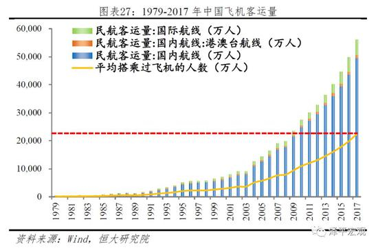中国航空客运量远落后于铁路客运量,搭乘过飞机的人口占比远低于美国。根据中国民航局统计,2017年中国航空客运量5.52亿人次,考虑到坐飞机往返至少2次,且存在大量长期出差的乘客和外国乘客,因此2017年中国搭乘过飞机的人次应该不超过2亿,相比于铁路,飞机出行票价更高,尚未成为中国人的出行首选。反观美国,2017年末美国总人口不超过3.3亿,但航空客运量达到9.4亿次,即使排除国外乘客,2017年美国至少有3亿人次搭乘过飞机,可见飞机是美国人出行的最重要的方式之一。