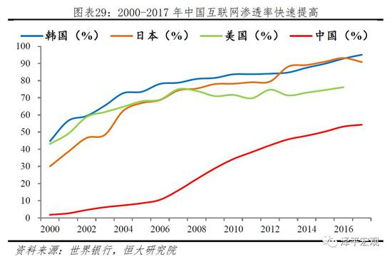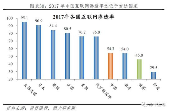 中国互联网渗透率高速发展,但依然远落后于发达国家。2000-2017年来中国互联网发展迅猛,渗透率由不足1%迅速提高至54.3%,但是和发达国家相比,我国的互联网渗透率仍然较低,2017年韩国互联网渗透率最高,达到95.1%,日本、德国、法国的互联网渗透率也都超过80%,而中国的互联网渗透率仅与南非(54%)相当,且仅略高于世界平均水平(45.8%)。