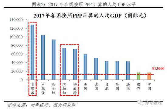 但是,按照PPP计算的人均GDP畸高,且我国人均GDP水平依然低于世界平均。2017年我国按照PPP计算的人均GDP仍然低于世界平均水平,与发展中国家齐平,遑论赶超美德日英法等发达国家。此外,从国际视角来看,虽然卡塔尔、科威特、阿拉伯联合酋长国按照PPP计算的人均GDP超过美国、德国等国家,但由于石油国家工业结构单一,依靠自然资源获得了较高的人均GDP,国际油价波动或军事活动等会对该类国家产生灾难性的影响,因此国际上很少有将卡塔尔、科威特、阿拉伯等划分为发达国家的。由此可见,人均GDP并不能作为划分发达国家和发展中国国家的唯一标准,而更应该参考综合国力。