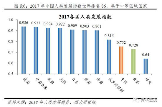 按照人类发展指数衡量,目前中国处于世界中游。联合国开发计划署(UNDP)每年发布人类发展报告,计算和发布人类发展指数(HDI)指标,对一个国家按照PPP计算的人均GNI、人均受教育年限和人均预期寿命进行综合处理得出结论,指标从0-1不等,指标超过0.8即定义为发达国家。1990-2017年,中国人类发展指数快速提高,但是2017年中国HDI指数也仅达到0.752,世界排名86位,处于全球中游,与德国(0.936)、美国(0.934)、英国(0.922)、日本(0.909)和韩国(0.901)等发达国家比起来相差甚远。可见,在综合水平HDI衡量下,中国目前仍是发展中国家。