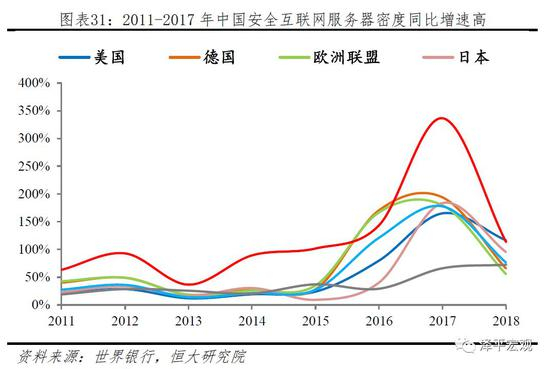 中国安全互联网密度低、增速快,欧美是中国的几十倍甚至上百倍。安全互联网服务器是指互联网交易过程中使用加密技术的服务器,是一个国家互联网基础设施建设的衡量指标。从增速看,2011-2018年中国安全互联网服务器密度同比增速远超世界各国,互联网基础设施建设高速发展。但是。2018年中国每百万人拥有的安全互联网服务器仅447.2个,世界平均水平已经达到6184.3个,和发达国家相比更是远远不足。2018年,美国、德国、日本每百万人拥有的安全互联网服务器分别为6.5万、5.7万和1.2万,为我国的几十倍甚至上百倍。