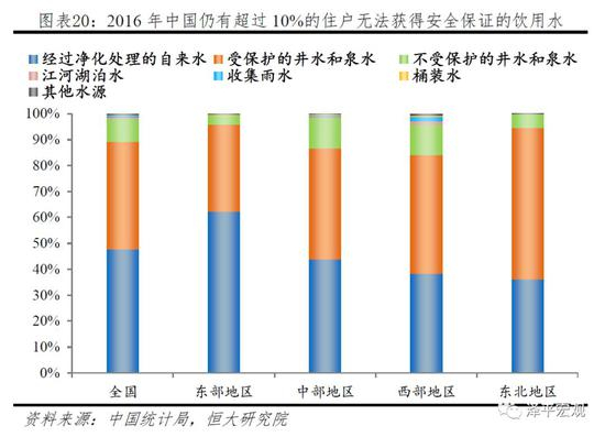 净化自来水覆盖农户仅47.7%,仍有超过10%的农户无法获得清洁饮用水。2016年我国家庭中10995万户的饮用水为经过净化处理的自来水,占总人口的47.7%;9572万户的饮用水为受保护的井水和泉水,占41.6%;而仍有10.7%的住户无法获得安全保证的饮用水,基本的清洁用水权益尚未得到保障。