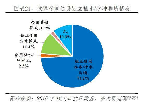 城镇存量住房卫生基础设施建设不完善。根据2015年的小普查数据,城镇住宅中仍有25.8%的家庭没有独立的抽水/水冲厕所,8.6%的家庭没有独立厨房,即使在城镇,我国的住房基础设施建设依然不够完善。