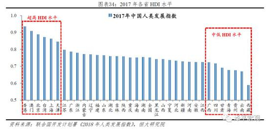 从各省2017年HDI角度衡量,北京、上海、天津、香港、澳门、台湾的HDI超过0.8,江苏、广东和浙江已接近0.8的水平,即将比肩发达国家水平,但与德国(0.936)、美国(0.924)、日本(0.909)等国家相比依然差距很大;此外,西藏、云南、贵州、甘肃等省份的HDI更是仅处于中低水平,西藏HDI指数(0.589)与赞比亚、约旦、阿富汗、海地等国水平接近。