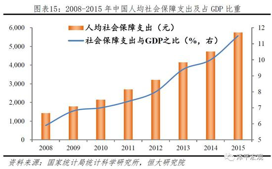 我国社会保障支出占GDP比重仅11.5%,不及欧洲占比最低的拉脱维亚(14.5%)。根据国家统计局科学研究院的数据,2008-2015年我国人均社会保障支出由1428.5元提高至5742元,社会保障总支出占GDP的比重由5.9%上升至11.5%。但是,和欧洲国家相比,仍然相去甚远。2014年,欧盟社会保障支出占GDP的比重高达28.7%,人均社会保障支出7903.4欧元,按当年汇率,约为我国的13倍,即使是占比最低的拉脱维亚,人均社会保障支出也达到1096.5欧元,社会保障总支出占GDP的比重达到14.5%,远高于我国。