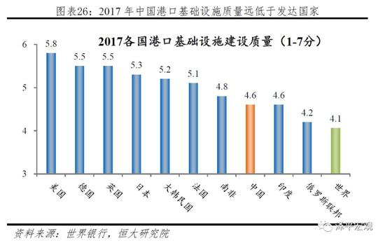 港口基础设施质量欠佳,甚至落后于部分发展中国家水平。世界银行对各国高管进行调查,用港口质量进行划分,衡量各国企业高管对本国港口设施的感受,1分表示十分欠发达国家,7分为十分发达高效。按照世界银行的调查数据,2017年中国的港口质量仅4.6分,而美国、德国、英国、日本的港口质量指数分别为5.8、5.5、5.5和5.3,可见我国港口基础设施建设水平还较低,落后于南非(4.8),与印度(4.6)的港口基础设施建设质量水平齐平。