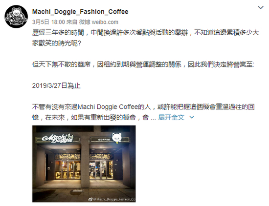 3月5日,Machi Doggie Fashion &Coffee在微博上发文称,“历经三年多的时间,中间换过许多次餐点与活动的举办,不知道这边累积多少大家欢笑的时光呢?但天下无不散的筵席,因租约到期与营运调整的关系,因此我们决定将营业至2019/3/27日为止。也希望顾客们趁着歇业前把握机会,再到店内重温回忆。在未来,如果有重新出发的机会,会再公布给大家知道。”