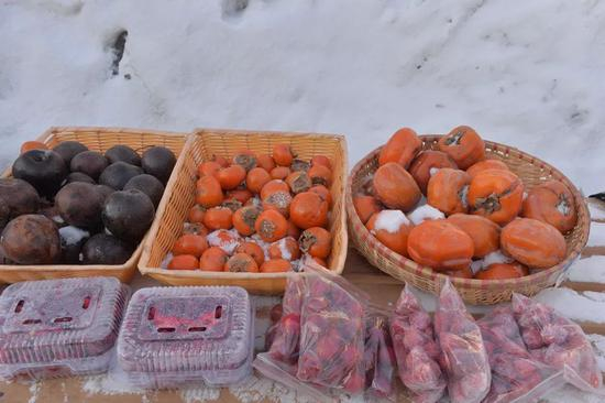 2019年1月4日,双峰林场中国雪乡风景区商贩卖的冻柿子和梨子。图片来自视觉中国